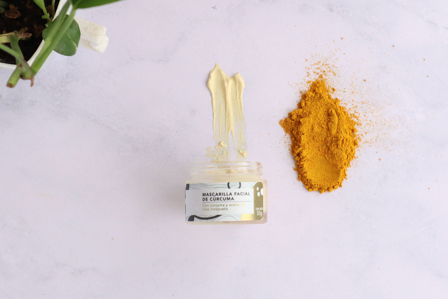 Mascarilla facial de cúrcuma con aceite de rosa mosqueta, vitamina E y ácido hialurónico botánico. Para piel grasa o con acné.